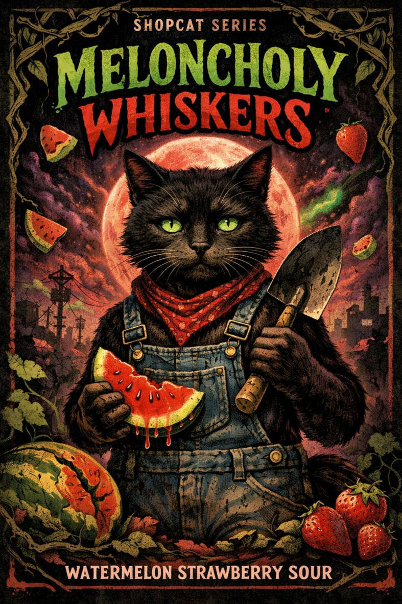 Meloncholy Whiskers is a bright yet brooding sour brewed with fresh watermelon and ripe strawberry, balancing juicy sweetness with a clean, tart bite.